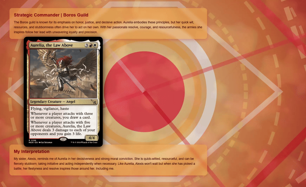 A simple Node.js server. A single highly interactive HTML file which animates complex AI generated SVG's behind five Magic: The Gathering characters.