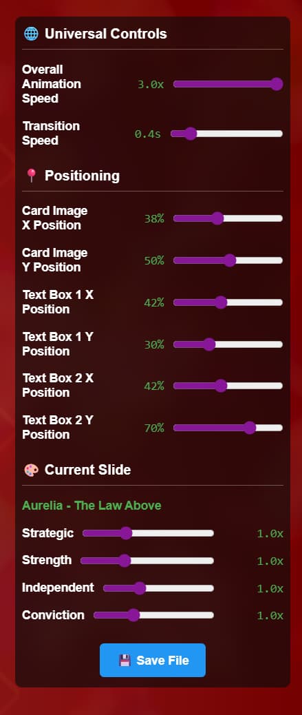 - Controls include animation speeds, transition speeds, positions of static content, and variables for specific animations.